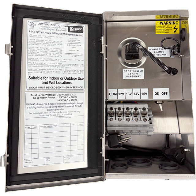 High-quality transformers add to the efficiency and durability of your outdoor lighting project. Dauer transformers and controls offer options such as multitap selectable voltages, photocell sensors or sockets, timers or timer sockets, dimmers, and surge protection. All models conform to UL and ETL specifications and offer 92% to 95% regulation.